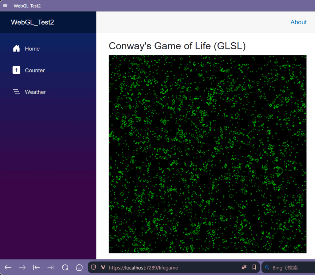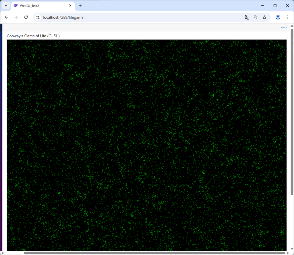 実行して/lifegameのページに飛ぶと、ちゃんとライフゲームのアニメーションが表示されました。