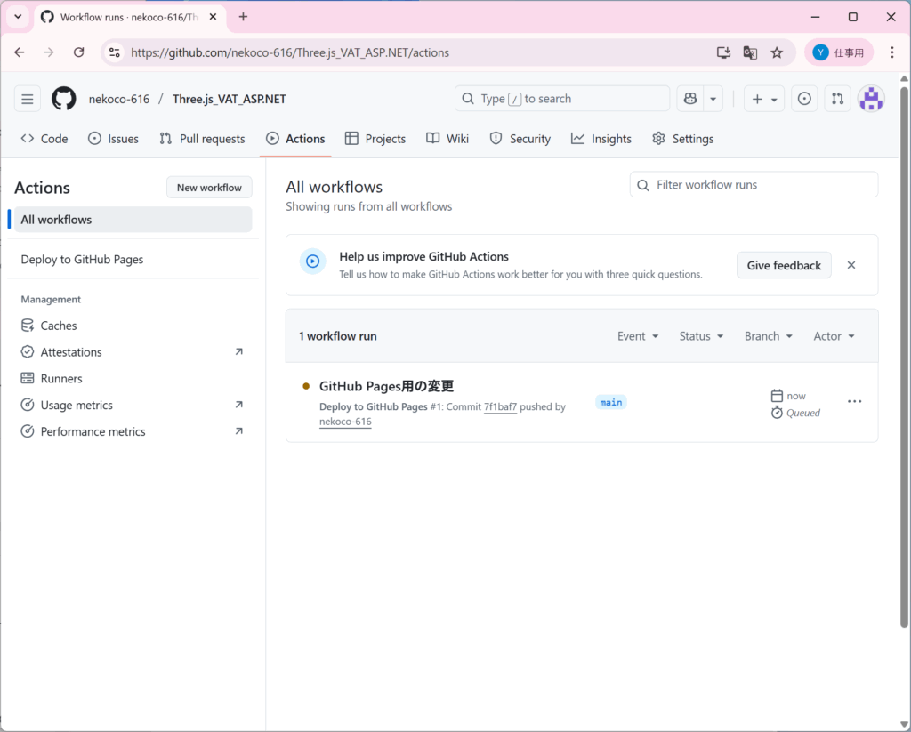 するとActionタブでActionが実行されていることがわかります。
