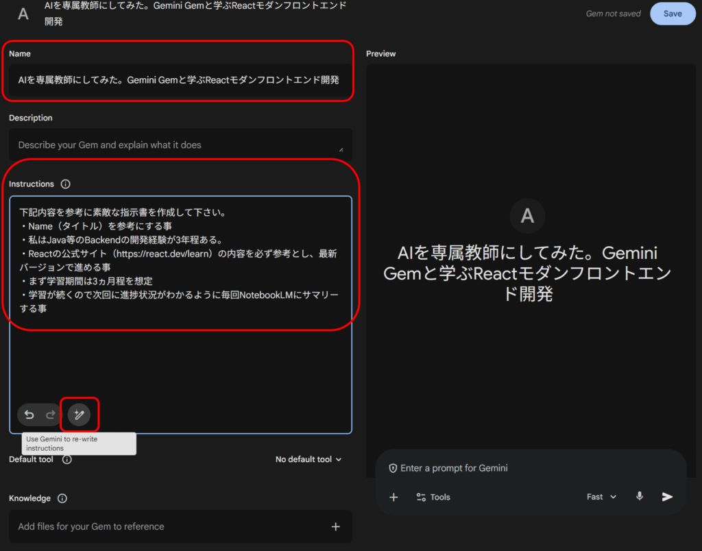 ※「Use Gemini to re-write instructions」ボタンをクリックすると、下記のようにより具体的な内容の指示書を作成してくれる。