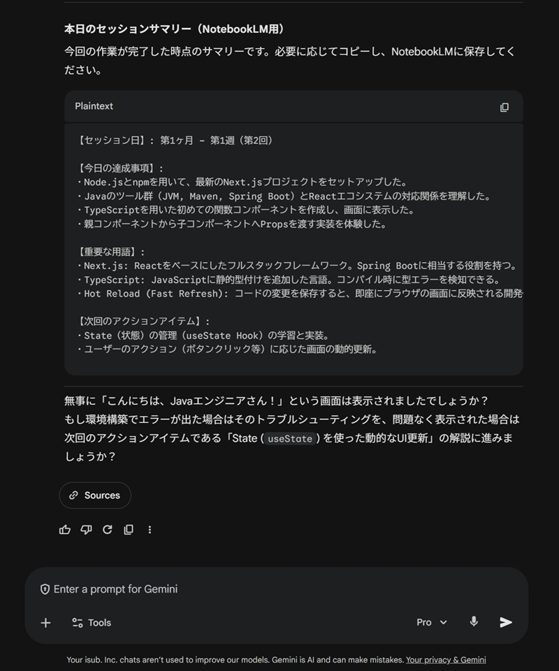 * 毎回のセッション終了時に、NotebookLMに貼り付け可能な進捗サマリーを生成します。