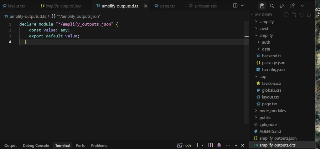 次に、amplify-outputs.d.ts という 「型定義ファイル(Declaration file)」 を作成し、以下のように宣言します。