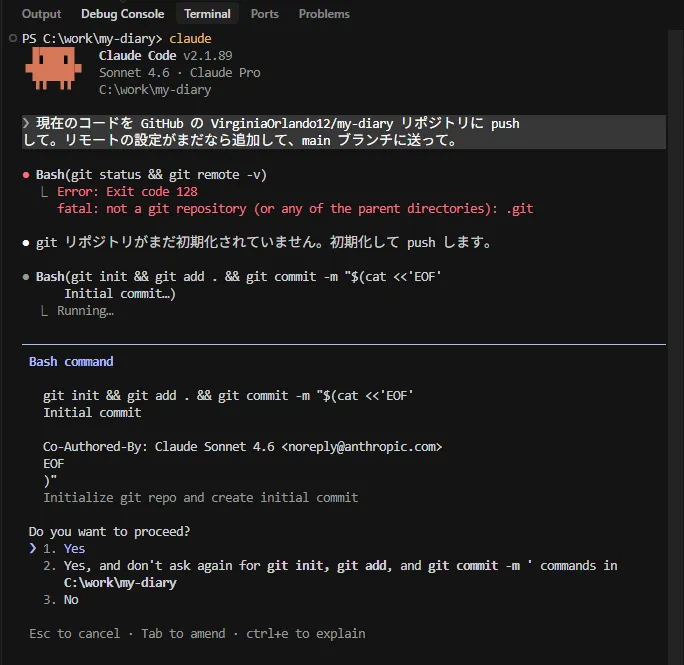 ステップ2:Claude CodeによるGitHubへのアップロード