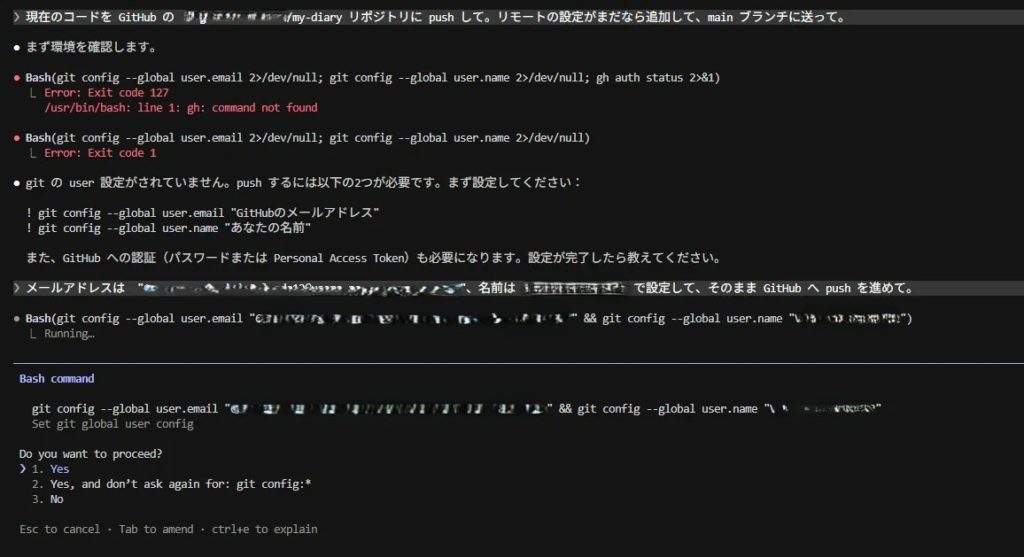 git init/git add ./git commitを実行。git config(メアド・名前)の設定もClaudeに任せられます。