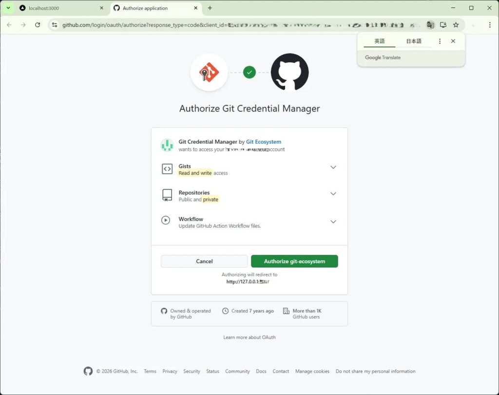 GitHubへコードを送る際、『Git Credential Manager』による認可を行います。