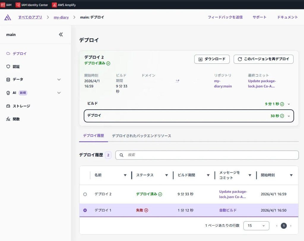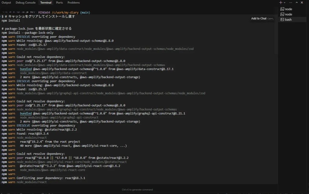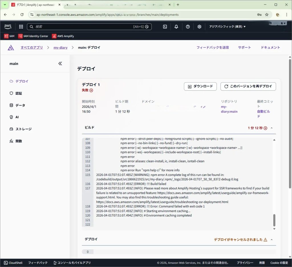 Amplifyでデプロイを行う際、package.json と package-lock.json の内容が食い違っているとエラーが発生します。エラー内容も、AWSに記載のエラーのスタックトレースをGeminiに貼り付けて相談して解明しました。(エラー内容を見ると、なんとなく対処方法が分かるようにもなっていますね)