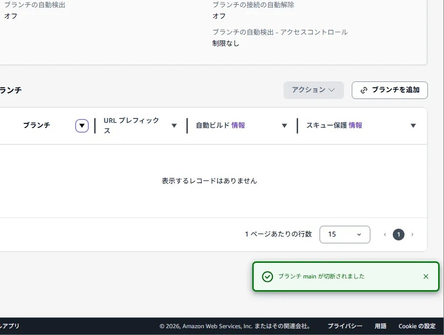 確認作業を終える際、不要なアクセス遮断とコスト防止のためにホスティングを動的に停止します。Amplifyコンソールの「ホスティング > ブランチ設定」より、main ブランチの接続解除(Disconnect)を選択します。