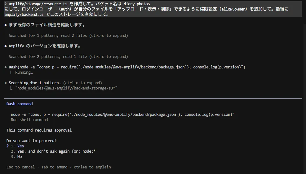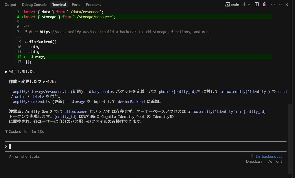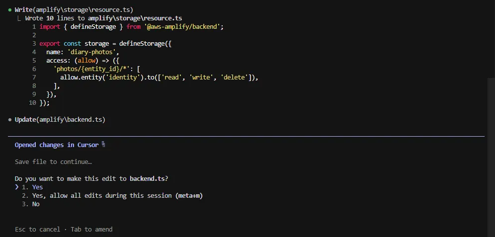 「amplify/storage/resource.ts を作成して。バケット名は diary-photos にして、ログインユーザー(auth)が自分のファイルを「アップロード・表示・削除」できるように権限設定(allow.owner)を追加して。最後に amplify/backend.ts でこのストレージを有効にして。」