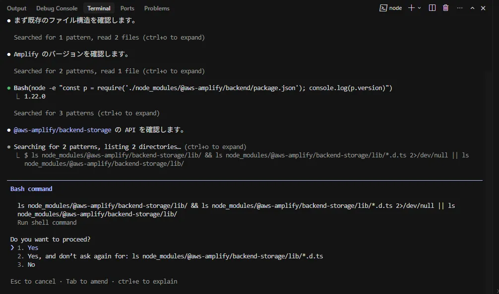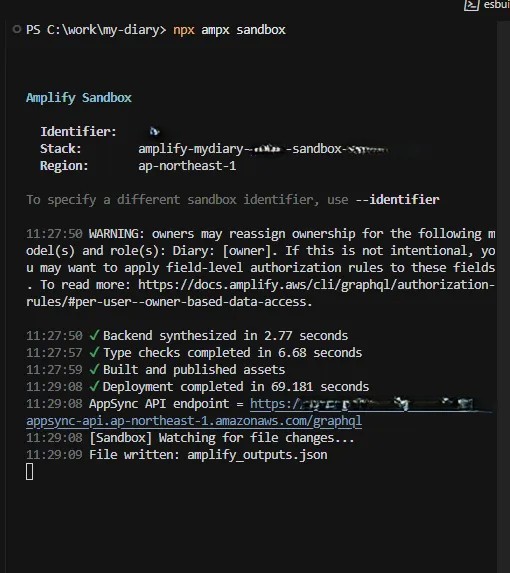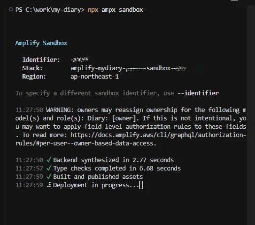 ターミナルで npx ampx sandbox を実行し、AWS上にテスト用のS3バケット等を作成します。