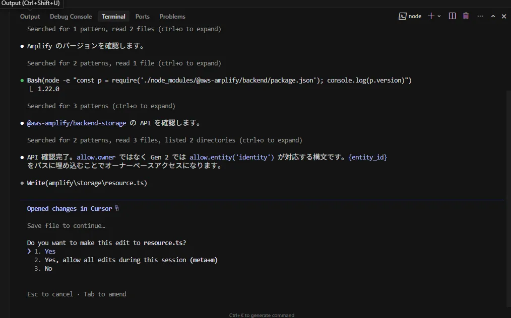 エージェントが自律的に調査し、「Storageの場合は allow.entity('identity') と書くのが正解だ」と気づき、最適なコードを作成してくれました。