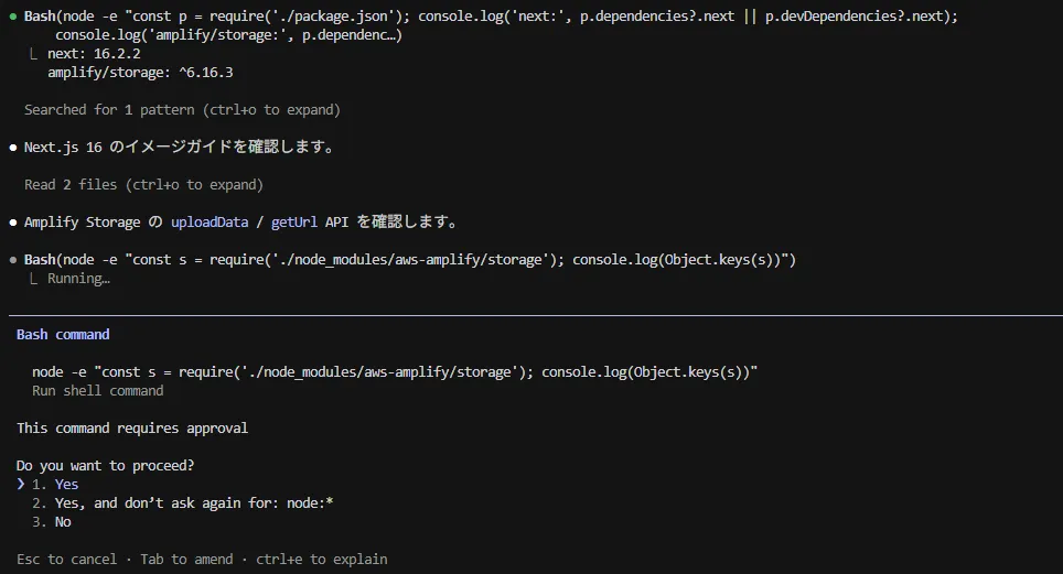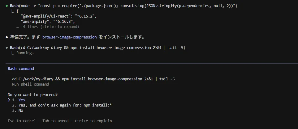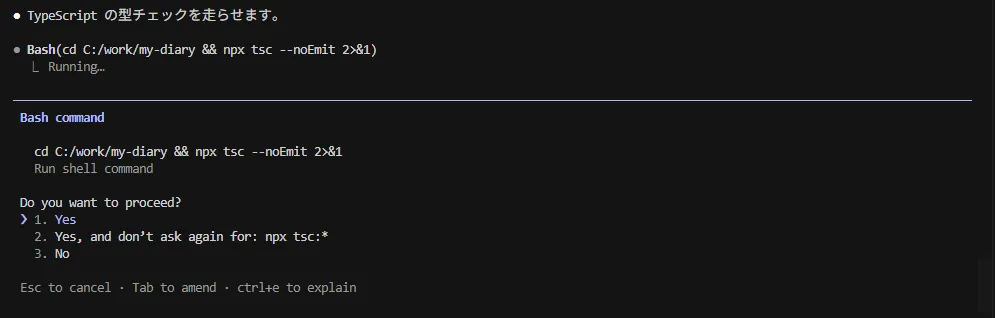 エージェントはライブラリのインストールから型チェック(npx tsc --noEmit)まで自律的に実行します。
