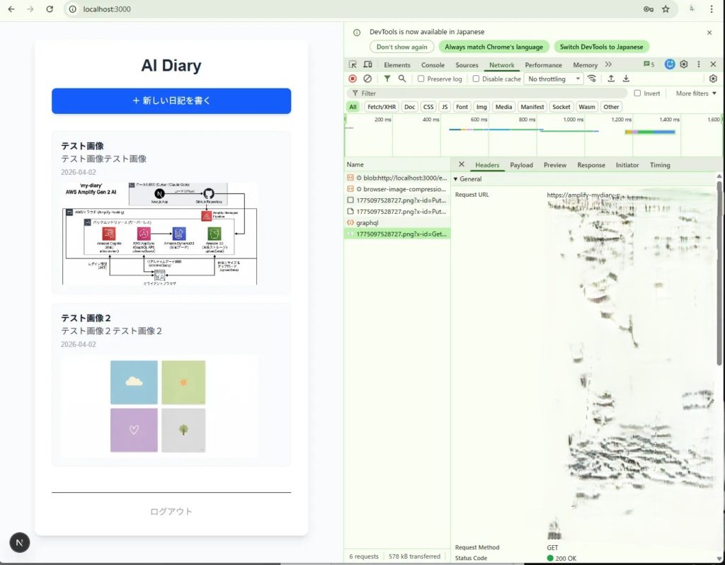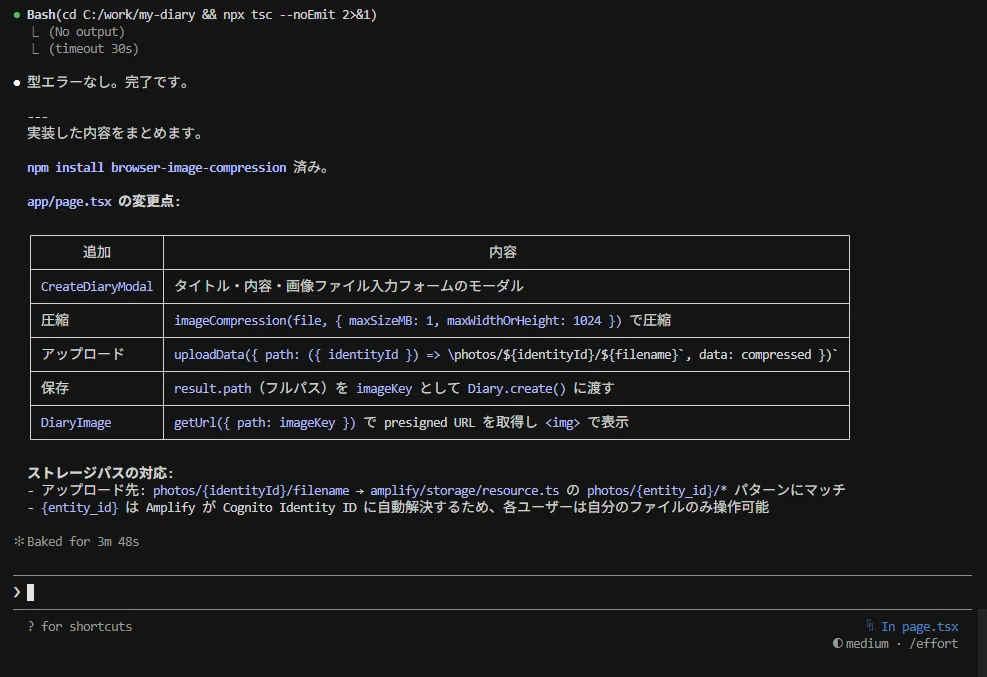 「フロントエンドの実装をして。browser-image-compression をインストールして。page.tsx を修正して、日記作成時に画像を選択できるようにして。画像はアップロード前に『最大1MB / 横幅1024px』にリサイズし、Amplifyの uploadData で S3(diary-photos)に保存して。保存した imageKey を Diary モデルに登録し、日記一覧でその画像を表示できるようにして(getUrl を使用)。」