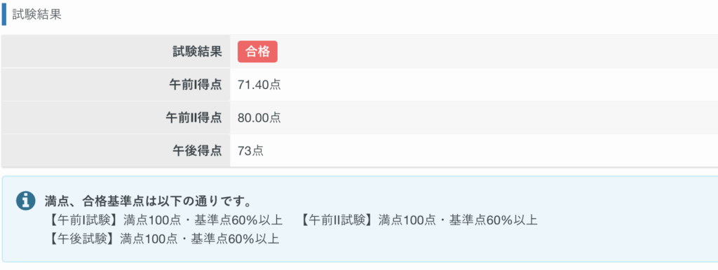 6割以上の正解で合格という条件から、完璧を目指していなかったです。言ってみればほぼ狙い通りといったところです。嘘です。全力で頑張って上振れして7割以上を取れて本当に良かったです。