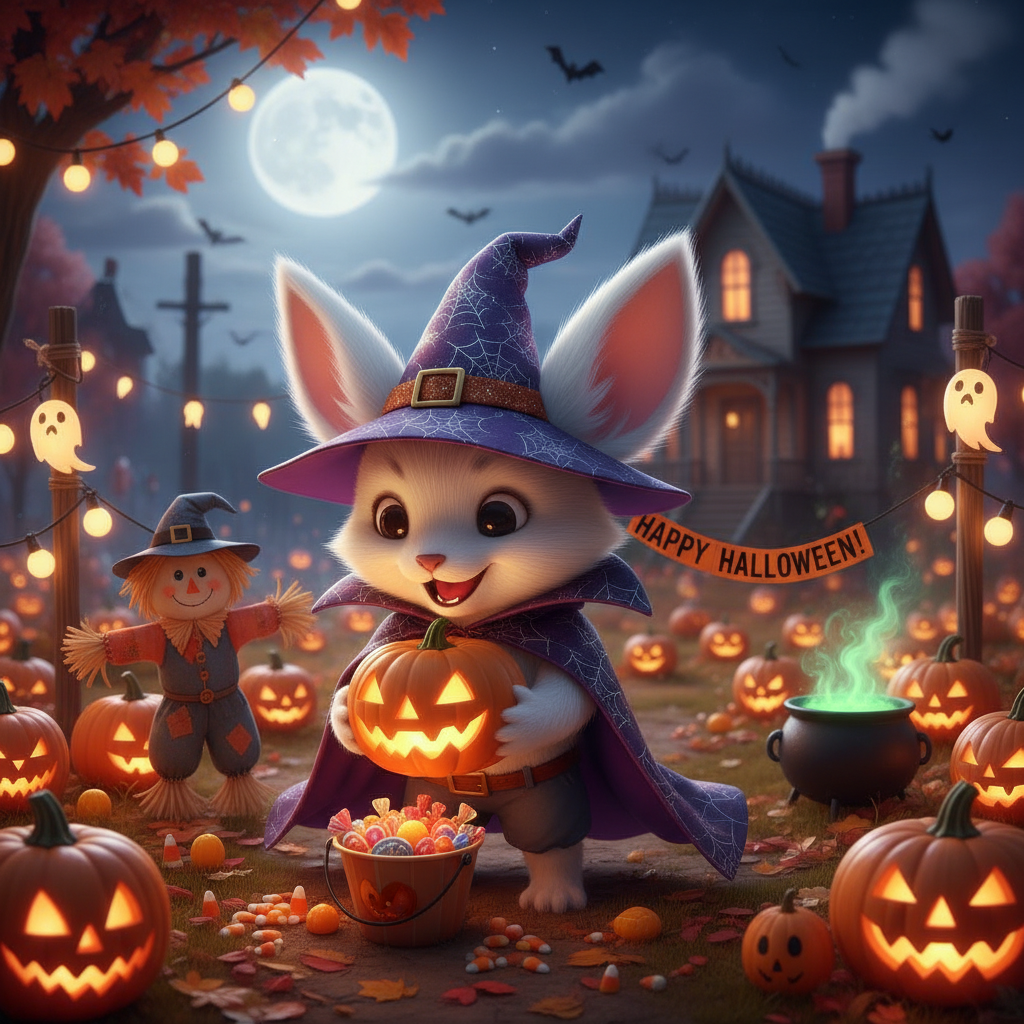 はい、承知いたしました。Pankoがハロウィンを楽しんでいる画像を生成しますね!細かいところはお任せください。