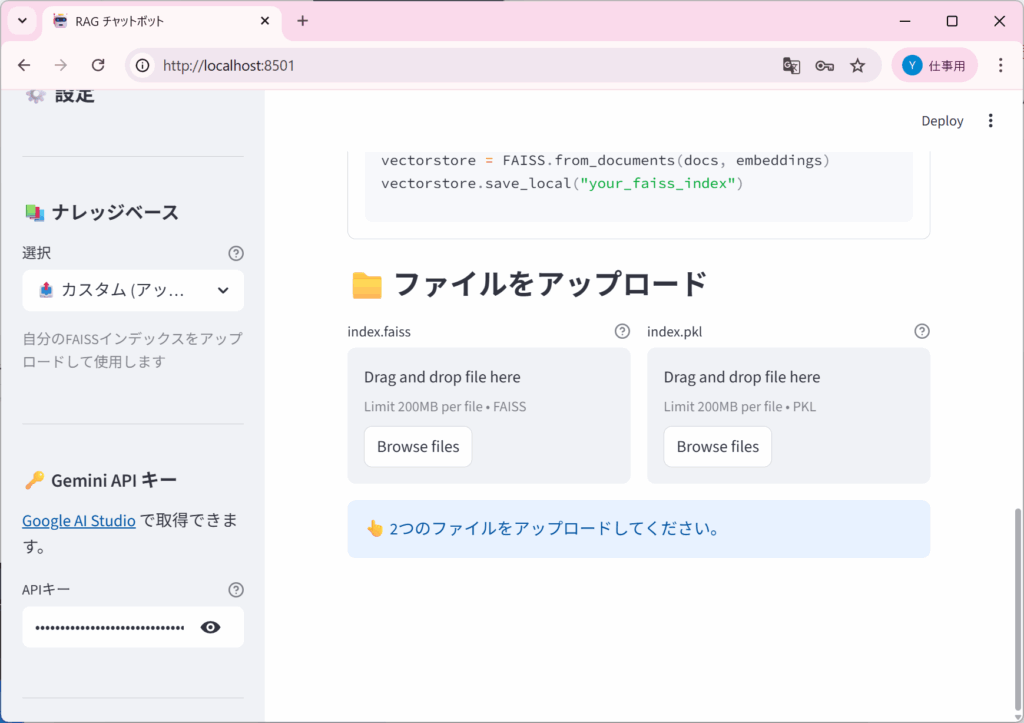 Streamlitにアップロード機能があったのでFAISSをアップロードできるようにしました。